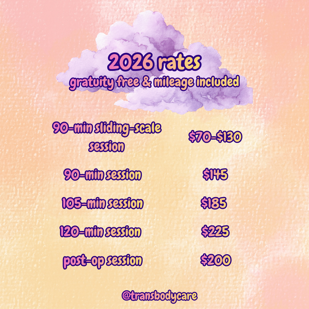 starting in 2026, my practice will be gratuity free! i understand how complex, confusing & anxiety-provoking deciding if & how much to tip can be. by being gratuity free, we will both clearly understand the financial expectations of our time together. additionally, the updated rates support my personal & professional needs without having to rely on the unspoken generosity of my clients